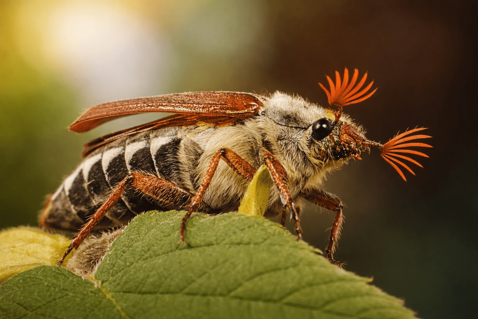 Der Maikäfer (Melolontha melolontha) ist einer der bekanntesten Käfer Mitteleuropas. Mit einer Länge von etwa 2,5 bis 3 cm, einer rötlich-braunen Färbung und den typischen fächerförmigen Fühlern ist er leicht zu identifizieren. Sein Körper ist an der Unterseite grau behaart, die Flügeldecken sind braun, und das schwarze Halsschild trägt zur markanten Erscheinung bei. Auffällig sind die kurzen, kräftigen Beine und die breiten, rötlich transparenten Flügel, die im Flug sichtbar werden.
